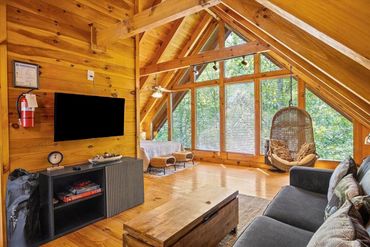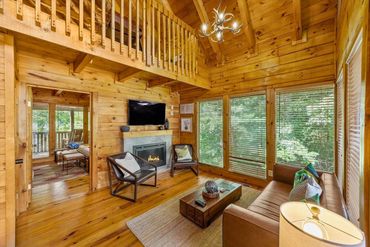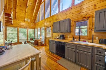 Step inside and discover an inviting open-concept living space featuring a cozy fireplace, vaulted ceilings, and large windows that fill the cabin with natural light. The fully equipped chef’s kitchen makes it easy to prepare home-cooked meals before gathering around the dining table or curling up by the fire.
