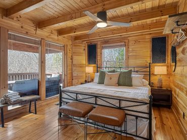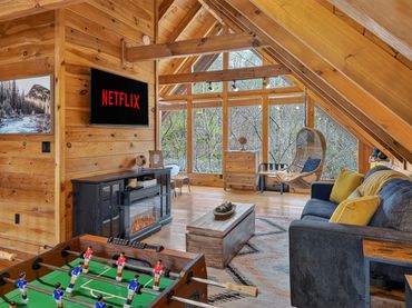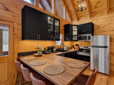 Step inside and discover an inviting open-concept living space featuring a cozy fireplace, vaulted ceilings, and large windows that fill the cabin with natural light. The fully equipped chef’s kitchen makes it easy to prepare home-cooked meals before gathering around the dining table or curling up by the fire.